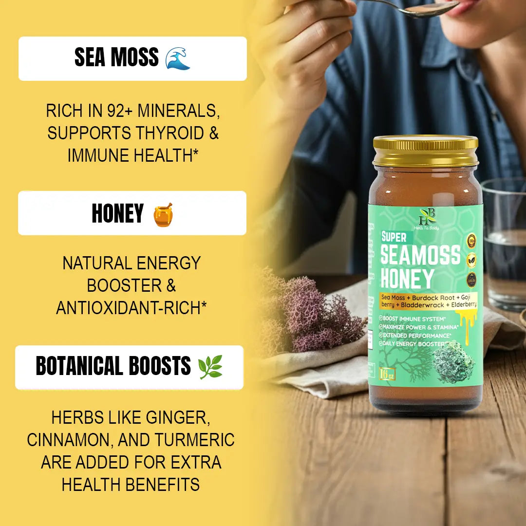 Super Sea Moss Honey is a handcrafted wellness blend made in the USA, combining multifloral raw honey with raw sea moss, ashwagandha powder, and elderberry powder. This powerful superfood fusion is designed to support daily energy, immune health, and overall vitality in a delicious, easy-to-use form.