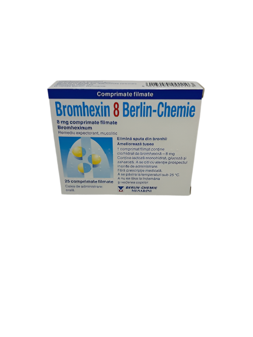 Bromhexine 8 from Berlin-Chemie is a mucolytic medicine that helps make breathing easier by thinning and loosening mucus in the airways. It is commonly used for coughs with thick sputum, bronchitis, chronic lung conditions, and respiratory infections.