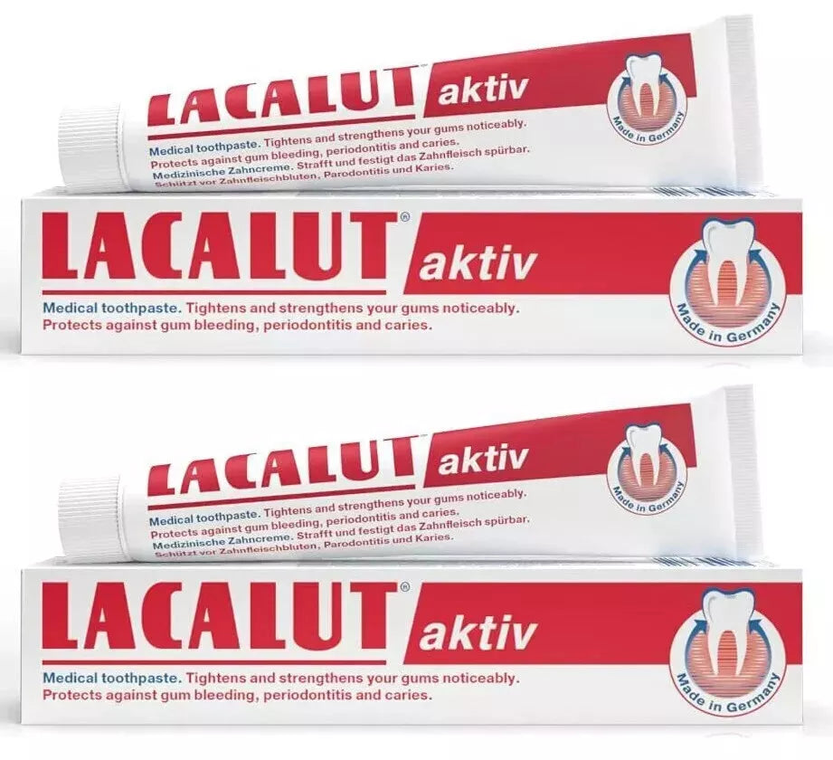 LACALUT Aktiv is a medicinal / therapeutic toothpaste designed to support gum health and strengthen teeth. It contains fluoride plus other active agents aimed at reducing gum bleeding, controlling plaque, and enhancing enamel resilience.